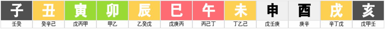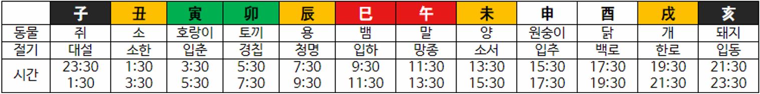 지장간의 의미도 알아보았고, 지지의 글자들마다 동물이 대입된다는 것도 알아보았습니다. 마지막으로 지지의 글자는 시간의 의미도 담겨있습니다. 명리학에서는 월(月)을 나눌 때 절기를 기준으로 나눕니다. 우리는 서양식 세계관으로 살아왔기 때문에 이 부분이 조금 생소하실 수 있는데, 예를들면 월주를 보시면 월지가 인목이라고 한다면 그 사람은 인월(寅月)에 태어난 사람입니다. 아래의 표를 보면서 따라오시면 되겠습니다. 인월은 입춘부터 경칩이 시작되기 전의 시간으로 입춘은 2월 3일 ~ 5일정도부터 시작되고 경칩은 3월 5일 ~ 7일 정도에 시작됩니다. 매년 하루이틀씩 차이가 있습니다. 그러니까 입춘과 경칩 사이에 태어난 사람이라면 인월에 태어난 것이므로 월지가 인목이 오게 됩니다. 예를들면 2월 20일에 태어난 사람은 월지가 인목이 되는겁니다. 그렇다면 시간의 개념도 쉽게 이해하실 수 있을 겁니다. 아래의 표에 시간도 제가 정리해서 적어놨습니다. 보시면 2시간의 단위로 시간이 바뀌는 것을 알 수 있습니다. 23시 30분부터 1:30분은 자시, 1시 30분부터 3시 30분은 축시가 되는 것입니다. 이번에는 오화를 예로 보겠습니다. 11시30분부터 13시 30분 사이에 태어난 사람은 시지가 오화가 오게 되는 것입니다.