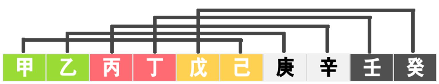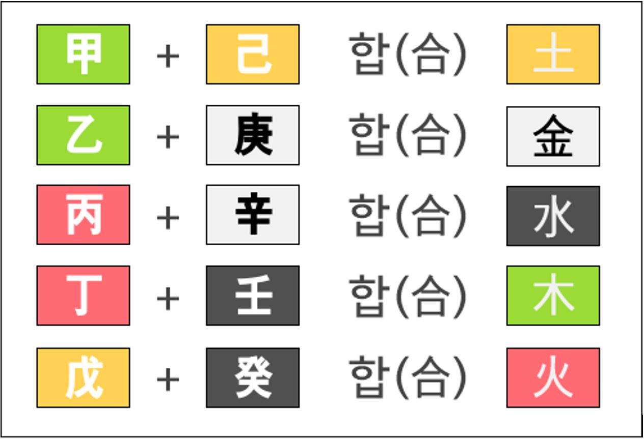 일단 천간합(天干合)부터 보겠습니다. 천간합은 말 그대로 천간의 열개의 글자들끼리 하는 합이라는 말입니다. 위의 사진을 보면 갑목과 기토가 만나서 토가 되는 것을 알 수가 있습니다. 이를 갑기합토(甲己合土)라고 말하시면 됩니다. 밑에는 그럼 아시겠죠? 을경합금(乙庚合金)입니다. 을목과 경금이 만나면 금이 된다는 말입니다. 하지만 엄밀히 말하면 합(合)과 합화(合化)는 의미가 다릅니다. 이를테면 갑목과 기토가 만나면 갑목도 토가 되어버리면 완전히 합을해서 화(化)해 버렸다고 하여 합화했다고 하는데, 그냥 합을 한다고 해서 오행의 속성이 실제로 저렇게 바뀌는 것은 아닙니다. 쉽게 말해 상황에 따라서 다르단 것입니다. 하지만 이런걸 염두에 두면 더욱 머리가 아파지므로 일단은 그냥 구구단 외우듯 외우시기 바랍니다. 그림에서 보시듯이 일정한 규칙으로 합이 되는것을 보실 수 있습니다. 그렇기 때문에 참조하시면 조금이나마 외우시는데 수월하시리라 생각합니다.