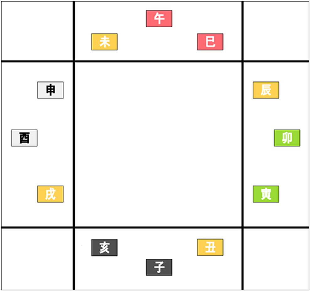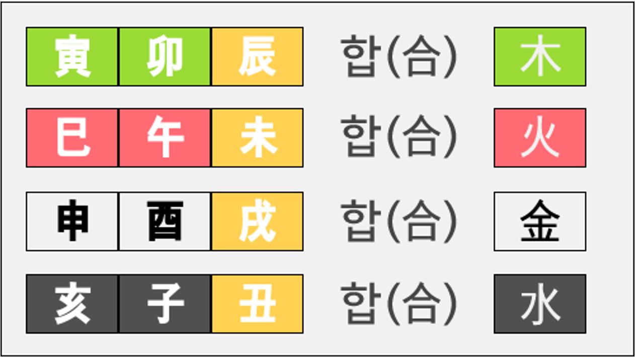 이번에 보실 합은 방합(方合)이라고 하는 합입니다. 뭔가 생긴 것이 외우기 굉장히 쉽게 생겼죠? 같은 오행끼리 모여있지 않습니까? 방합이라고 하면 같은 방위끼리의 합이라는 말입니다. 각 오행의 글자들은 계절을 상징하면서 동시에 방향도 상징합니다. 이것은 아래의 그림을 참조하시면 쉽습니다. 글자들을 순서대로 주욱 나열하여 놓았습니다. 결론부터 말씀드리면 인묘진은 동방(東方)입니다. 동쪽이란 뜻이죠. 사오미는 남방(南方), 신유술은 서방(西方), 해자축은 북방(北方)입니다. 그런데 그림을 보시면 알겠지만 우리가 알고있는 동서남북 방향이 아니라 북쪽과 남쪽이 바뀌어 있죠? 어쩔 수가 없습니다. 시계방향으로 글자들을 돌리면 동서남북이 전부 뒤바뀌게 되고, 시계 반대방향으로 돌리면 북쪽과 남쪽만 바뀌게 되어 있습니다. 이건 단지 우리가 눈으로 볼 때의 동서남북의 방향일 뿐이므로 신경쓰지 마시고 그냥 외워주시면 됩니다. 화는 따뜻한 기운이니까 남쪽, 수는 차가우니까 북쪽으로 외우면 쉽습니다. 방향과 더불어 계절의 의미도 있다고 하였죠? 인묘진은 봄의 계절이기 때문에 봄의 글자들끼리 만나서 강력하게 목의 힘이 되는 것입니다. 여름의 계절인 사오미, 가을의 신유술, 겨울의 해자축끼리 만나서 강력하게 그 계절의 오행으로 뭉친다고 생각하시면 쉽겠습니다. 방합과 같은 경우에는 반드시 세 글자가 전부 있어야 합이 된다고 하겠습니다. 또한 방합은 계절의 합이기 때문에 세 글자중에 한글자는 반드시 월지에 들어있어야 합이 된다고 보셔야 합니다. 방합 역시 삼합과 마찬가지로 국을 이룬다고 표현합니다. "인묘진의 목국(木局)을 이룬다." 이런식으로 표현하게 되겠습니다.