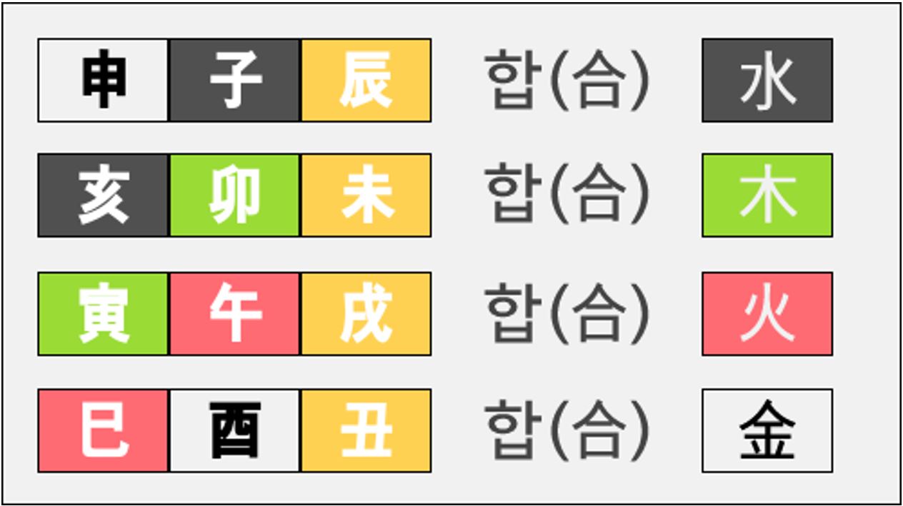 천간을 보았으니 이제 지지로 넘어가겠습니다. 지지끼리도 당연히 합을 하고 충을 하겠죠? 일단 충을 먼저 설명드리면 충은 천간과 동일합니다. 서로 음양이 같고 극하는 성분들끼리 충을 하는 겁니다. 이 이야기는 글의 맨 마지막에 다시한번 그림을 보면서 다시 다루겠습니다. 자, 지지의 합을 보겠습니다. 위에 그림에서 보시면 신금과 자수와 진토가 만나서 수가 된다고 되어 있죠? 신자진합수(申子辰合水)라고 부릅니다. 그 밑에는 해묘미합목, 그 밑에는 인오술합화, 그 밑에는 사유축합금입니다. 자세히 보시면 아시겠지만 가운데 있는 글자의 오행으로 합이 됩니다. 위의 그림에서 보고 계시는 합이 삼합(三合)이라고 하는 합입니다. 그리고 가운데 있는 글자인 자오묘유(子午卯酉)는 왕지(旺支)라고 합니다. 이 왕지는 아마 많이 들어보셨겠지만 '도화'의 글자들이기도 합니다. 후에 공부하게 될 것이니 일단 넘어갑시다. 그렇다면 이 세글자가 모두 있어야 합이 되느냐, 그렇지는 않습니다. 대신에 왕지의 글자는 반드시 있어야 합니다. 신자진합수의 경우 신금과 자수만 있거나 자수와 진토만 있어도 합이 됩니다. 단, 가운데 글자인 왕지가 빠지면 합이 안됩니다. 그러니까 신금과 진토와는 합이 안된다는 말입니다. 이렇게 삼합 중에 두 글자끼리만 합을 하는 것을 반합(半合)이라고 합니다. 이렇게 삼합이 되면 국(局)을 이룬다고 표현을 합니다. "신자진이 합을 하여 수국(水局)을 이룬다." 이런식으로 표현하게 됩니다. 지지가 이렇게 국을 이룬다는 소리는 네 글자 중에 무려 세 글자가 합심하여 한가지의 오행으로 향하기 때문에 굉장히 강한 힘이라서 국(局)이라는 표현을 사용합니다.