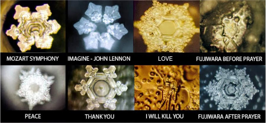 에모토 마사루의 <물은 답을 알고 있다>라는 책을 들어본 적 있으신지 모르겠습니다. 그 책에서 보면 사람의 말이나 음악 등을 물에 들여줬을 때 물의 결정이 달라지는 것을 보게 됩니다. 이를테면 물에다 대고 사랑스러운 말을 계속 들려주었을 때 물의 결정은 대칭적인 아름다운 육각 결정을 나타내게 되는 반면에 욕을 한다거나 부정적인 말을 계속 듣게 된 물은 일그러진 결정을 얻게 됩니다. 이를 보면 사람의 말의 파동 속에 어떤 에너지가 담겨 있다는 것을 유추해 볼 수 있습니다. 심지어 말하지 않고 글자로 프린팅을 해서 물에게 보여줘도 비슷한 결과가 나왔다고 하니 분명 사람의 눈에 보이지 않는 기운이 세상에는 존재함을 알 수 있습니다.
