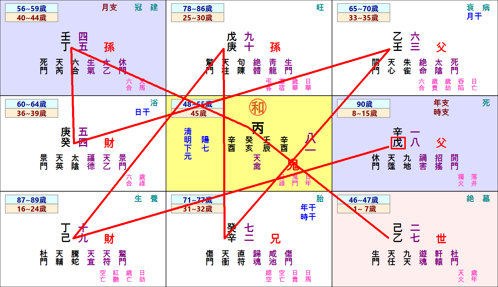 칠태궁에 戊 보이시죠? 칠국이니까 칠태궁부터 시작합니다. 양둔에 태어난 사람이니까 戊己庚辛壬癸丁丙乙 순서로 순포하면 되죠. 연국의 경우 중궁에는 丙 한글자만 들어가있죠? 연국천반은 중궁에 들어가지 않고 중궁은 연국 지반만 들어가기 때문입니다.