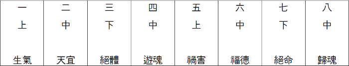 자 위의 표를 보시죠. 일상(一上)은 생기(生氣)라고 적혀있죠. 맨위에 숫자는 그냥 진행순서라고 보시면 됩니다. 一, 二, 三 순서로 되어있죠. 영어로 하면 step1, step2, step3 뭐 이런거죠. 상(上)이라는 글자는 괘의 상효를 변화시키라는 말입니다. 그러면 괘가 하나 나올텐데 그 괘가 있는 궁에 가서 생기(生氣)를 적으라는 거죠. 자 해볼까요. 일감궁은 감괘(☵)죠. 감괘에서 맨 위에 있는 상효를 변화시키면 무슨괘가 되나요? 손괘(☴)가 되죠. 그럼 손괘가 있는 사손궁으로 가서 생기라고 적으라는 겁니다. 실제로 위에 기문국을 보시면 사손궁에 생기가 들어가있죠? 다 그럼 다음단계로 갑시다. 이중천의(二中天宜)입니다. 중간 효를 변화시켜서 천의라고 쓰라는 것이죠. 그럼 우리 지금 첫번째 단계에서 생기를 사손궁에 적었죠. 사손궁의 손괘(☴)에서 중효 변화시키면 무슨 괘가 나오나요? 간괘(☶)죠. 간괘 무슨궁이죠? 팔간궁이죠. 그럼 팔간궁 가서 천의라고 적으면 됩니다. 확인해 보면 팔간궁에 천의가 들어가 있는걸 확인할 수 있습니다. 이렇게 팔중귀혼(八中歸魂)까지의 단계까지 거치면 중궁을 제외한 8개의 궁에 팔괘법의 순서대로 하나씩 배치가 되는 것입니다.