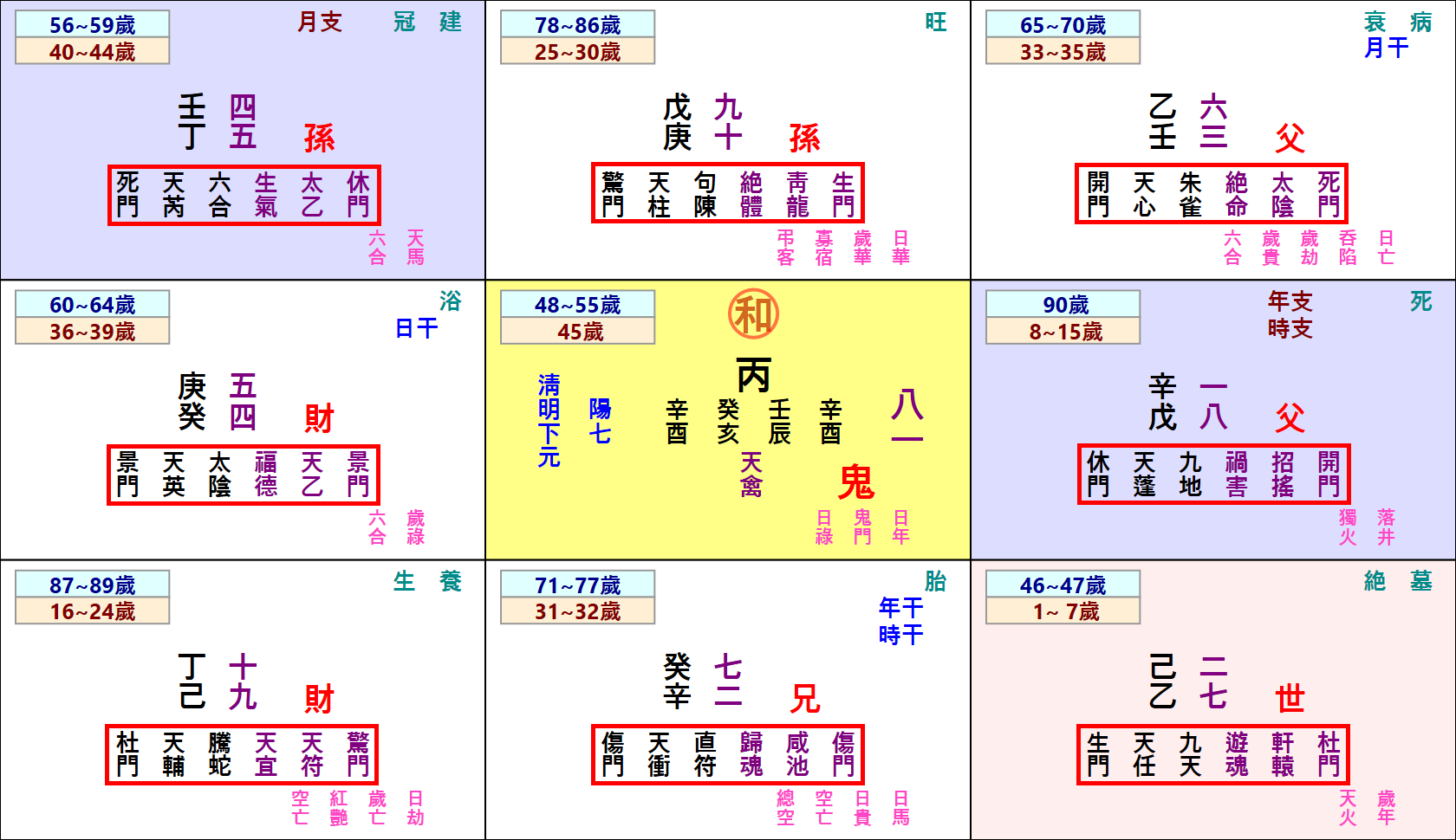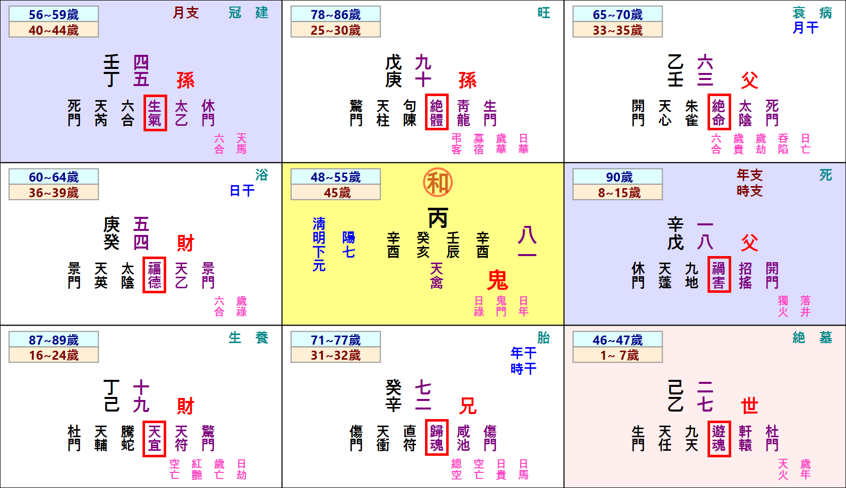 위에 기문국 세궁(世宮)에 보면 유혼(遊魂) 들어있는거 보이시나요? 그러면 세궁이 본인을 의미하니까 뭔가 내가 정착이 안되고 이리저리 왔다갔다 한다는 식의 해석이 가능한 것입니다. 뭐 절명이 들어있으면 목숨이 끊어진다고 해석을 한다거나 하는 식이죠. 하지만 아시겠지만 그렇게 단편적이고 일차원적인 해석으로는 정확한 운명의 분석은 힘들죠. 일단 원리가 그렇다는 것을 알려드리는 것입니다.