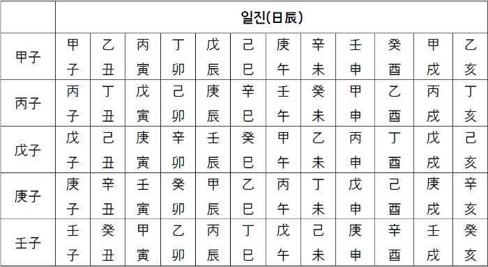 마지막으로 오자원(五子元)이라는 것인데, 부두와 비슷한 개념이라고 보시면 됩니다. 일진이 어느 자원(子元)에 들어가있는지의 개념입니다. 아래의 표를 참조하시면 됩니다.
