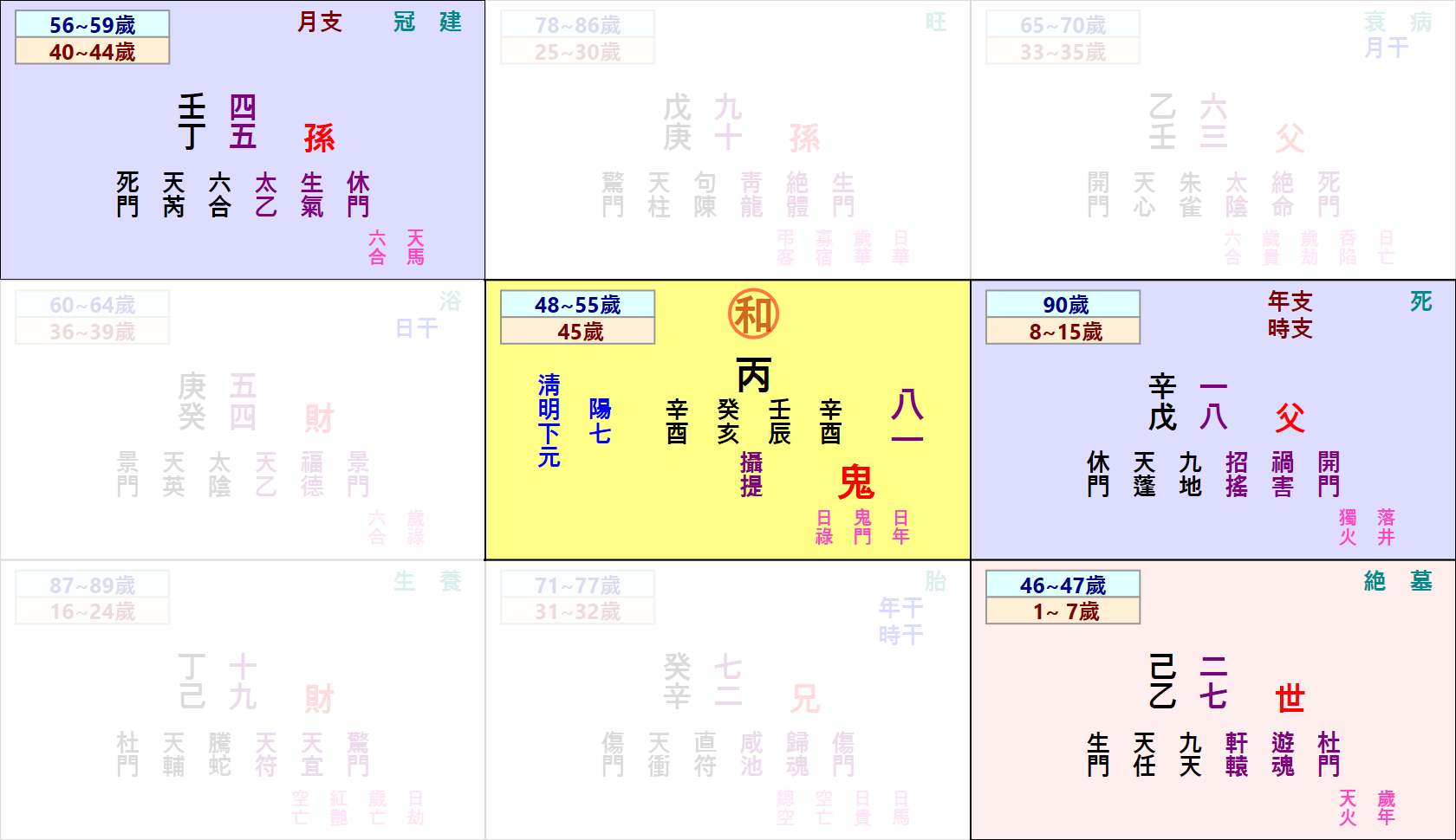 그림을 보시면 이해가 쉬울겁니다. 위의 그림은 원래의 기문국이고, 아래의 그림은 제가 동궁을 눈에 띄게 표시한 것입니다. 원래의 기문국을 봐도 동궁은 색깔자체를 눈에 띄게 다른 색깔로 표시를 해놨죠. 기문국을 해석할 때 저 동궁들을 비중있게 해석을 하는 것입니다. 동궁을 어떻게 정하냐면 사주의 지지를 기준으로 정합니다.