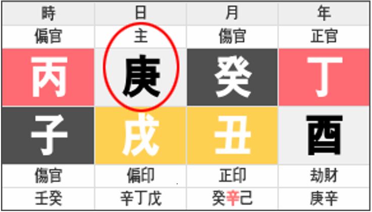 본인의 명식을 뽑으면 누구나 위와 같이 8개의 글자들이 나오는데, 위의 예에서 보면 일주의 2개의 글자 중에 천간의 글자인 경(庚)과 지지의 글자인 술(戌)을 합쳐서 경술일주(庚戌日柱)라고 부르게 되고, 그 중에서도 일주의 천간의 글자인 일간(日干)은 빨간색으로 동그라미를 쳐 놨는데, 바로 저 글자가 사주 주인공 자신이 되는 것입니다. 글자 위에 보면 주인 주(主)자가 적혀 있는 것이 보이시죠? 사주의 주인이란 뜻입니다. 친구들끼리 이야기할 때 "너 무슨 일주야?" 라고 물어본다면, 위 사주의 주인공은 "나 경술일주야."라고 대답하면 되는 것입니다. 그렇다면 친구가 다시 "너 금(金)이네"라고 할 수도 있을 겁니다. 오행을 공부할 때 다시 하겠지만 배경이 흰색인 글자들은 금이기 때문입니다.