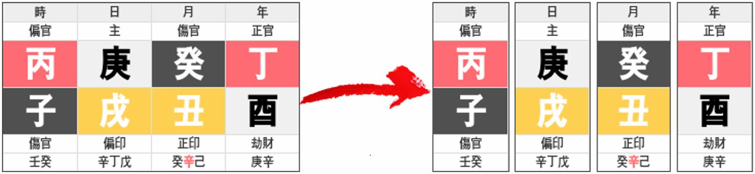 좌측의 명식을 우측과 같이 네 개의 기둥으로 분해해서 보면 총 4개의 기둥, 다시 말해 4개의 주(柱)로 쪼갤 수 있습니다. 눈치를 채셨겠지만 그래서 사주(四柱)라고 부르는 것입니다. 그리고 배경에 색깔이 있는 글자들을 보면 각 주마다 2개의 글자씩 총 8개의 글자입니다. 그래서 팔자(八字)가 되는 것입니다. 이를 합쳐 사주팔자(四柱八字)가 되는 것입니다.